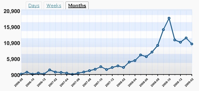 As you can see, the traffic peaked in October, then has stayed in the 11,000 to 12,000 range. I blame it on the economy. But at least our chart looks better than the stock market…