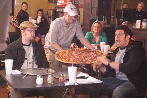 One of his challenges is to tackle the Carnivore Pizza with a friend. (Here’s a commercial for that episode.) The pizza comes from Big Pie in the Sky, a New York style pizzeria located in Kennesaw, GA.