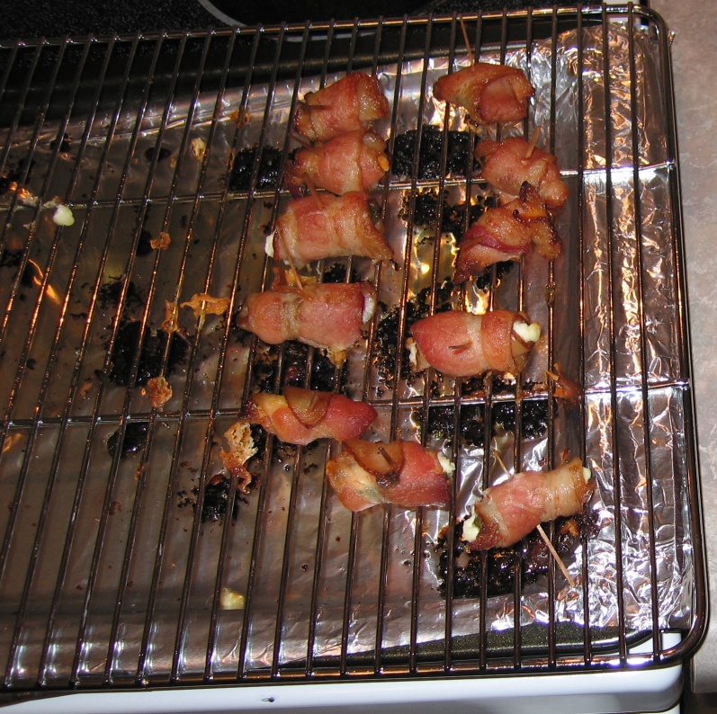 The second item we sampled was bacon-wrapped cream-cheese-filled jalapenos. We removed the seeds so they wouldn’t be too spicy (for some). These were also delicious, although I’d like to experiment with different types of cheese. Cooking them on a rack is essential (as I will explain in further detail on the next item). They were also served on a stick (well, a toothpick).