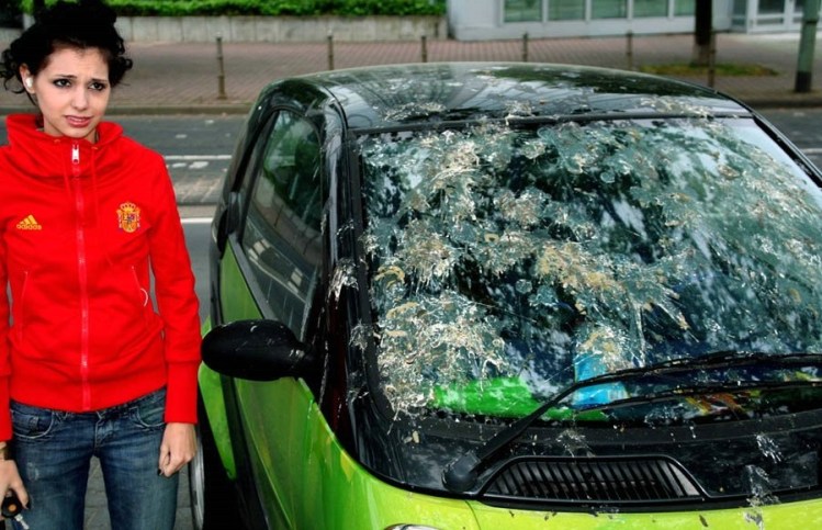 Last week’s caption contest dealt with a serious topic — the oil spill.  Since we can’t have too much seriousness here on this blog, this week’s caption contest will use a photo that leads to easy jokes and easy humor — a car windshield covered in bird poop, and the car’s owner looking quite distraught.  So write a caption explaining what’s going on here or what the woman is thinking or what her friends are thinking, or make up something totally different.  Just keep it clean and funny.