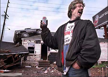 Now that I’m back from vacation, let’s get the weekly caption contest back on schedule. While in Colorado, I saw a few bad drivers. But none of the bad driving I saw can compete with this picture. Somehow a truck is on the roof of a house, and there’s a fair bit of destruction around it. There’s also a guy in the picture, holding a beer and laughing.